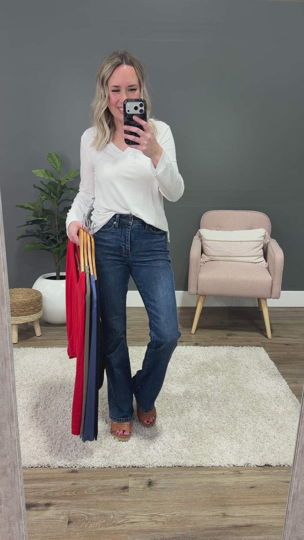 Alyssa is 5'5" and wears a size 25 in jeans, a small in bottoms and a small in tops.