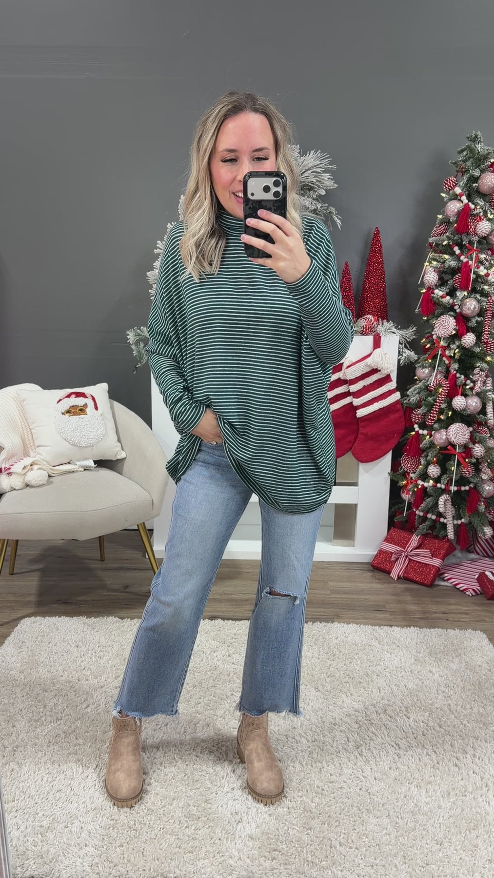 NEW! Here I Am Striped Dolman Sleeve Turtle Neck - Deep Green & Cream