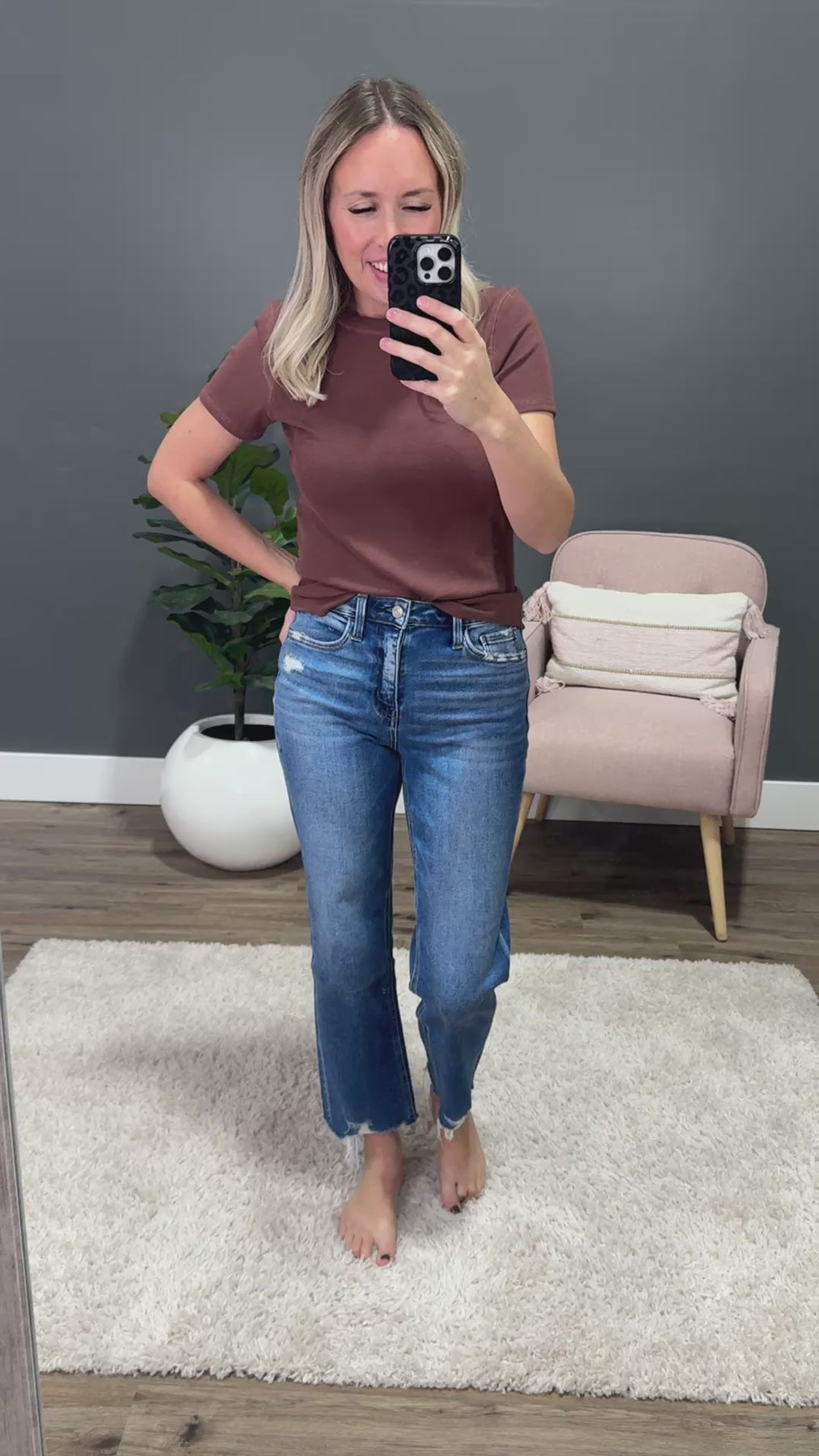 Courtney is 5'6" and wears a size 25 in jeans, a small in bottoms and a small in tops.